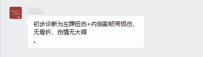 據(jù)了解,徐杰受傷后第一時間被送到醫(yī)院檢查。據(jù)籃球記者賈磊報道,徐杰的檢查結(jié)果出來了,骨頭和韌帶都沒事,只是硬傷,應(yīng)該問題不是很大,球迷們可以放心了!也可以這樣說,徐杰就是左腳踝嚴重扭傷。另據(jù)球迷群透露,徐杰左踝扭傷+內(nèi)側(cè)副韌帶損傷,無骨折,傷情無大礙。不過徐杰肯定一時打不了比賽,從現(xiàn)場受傷情況來看,他起碼要休息半個月以上。